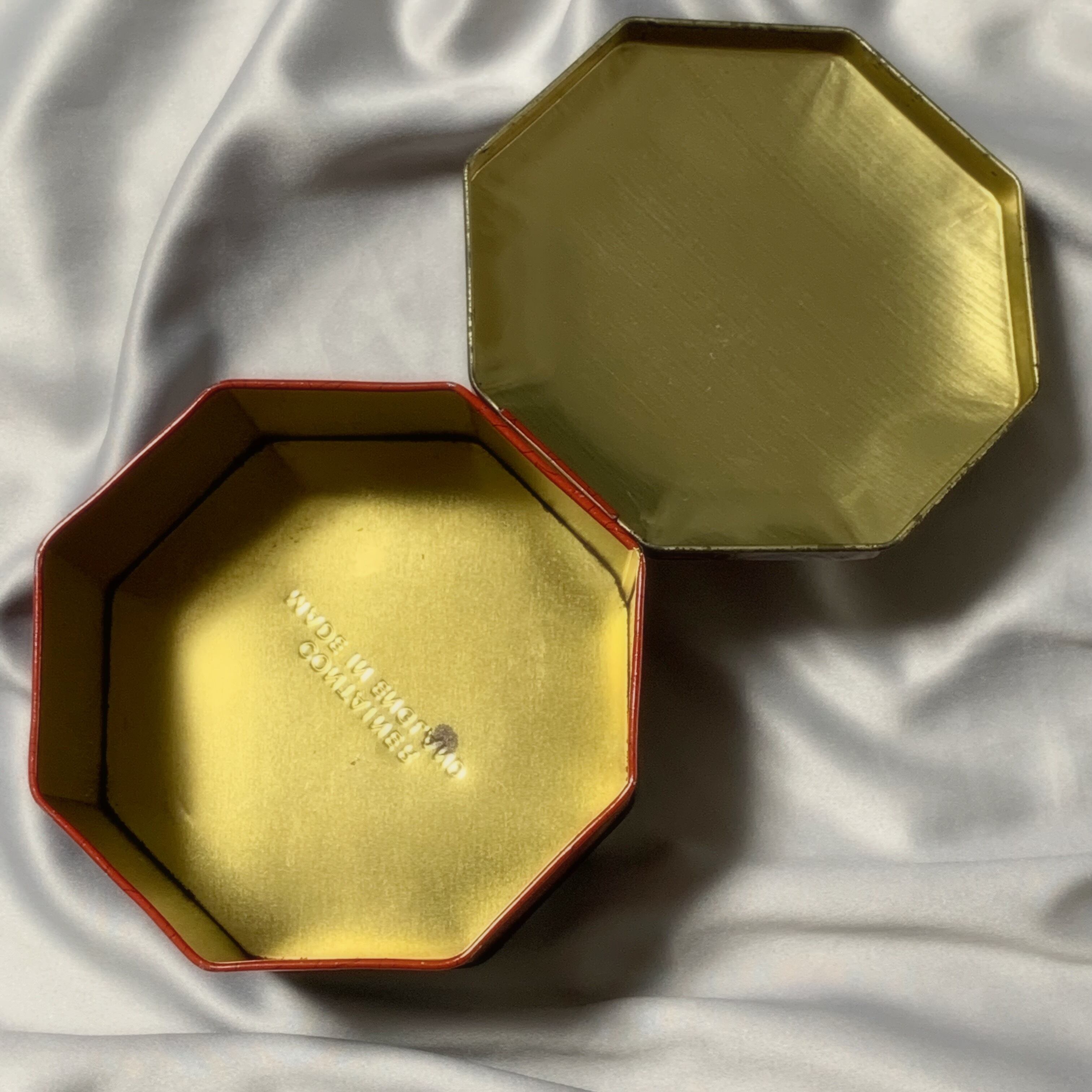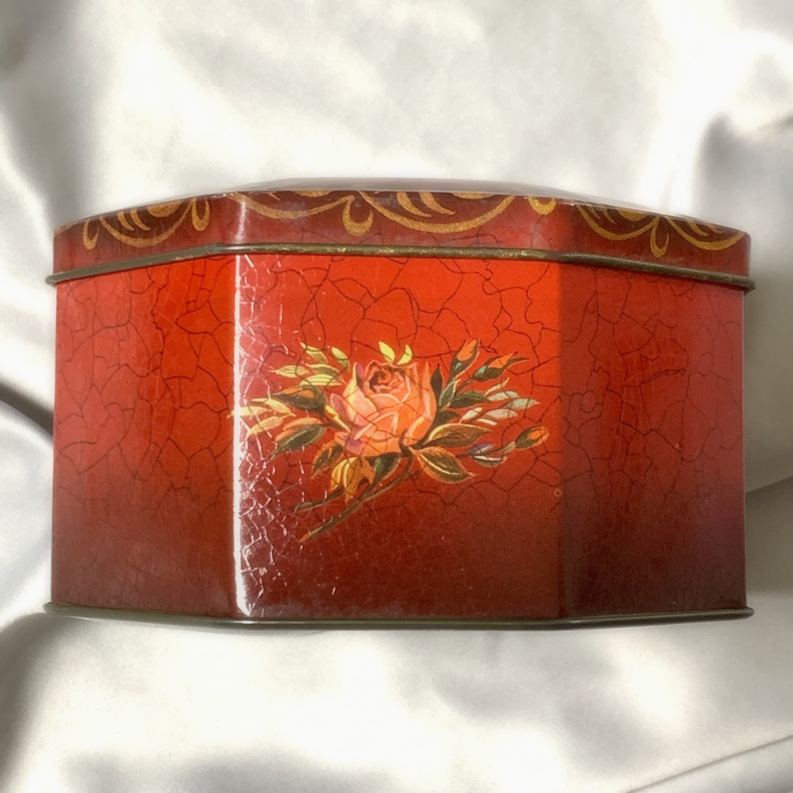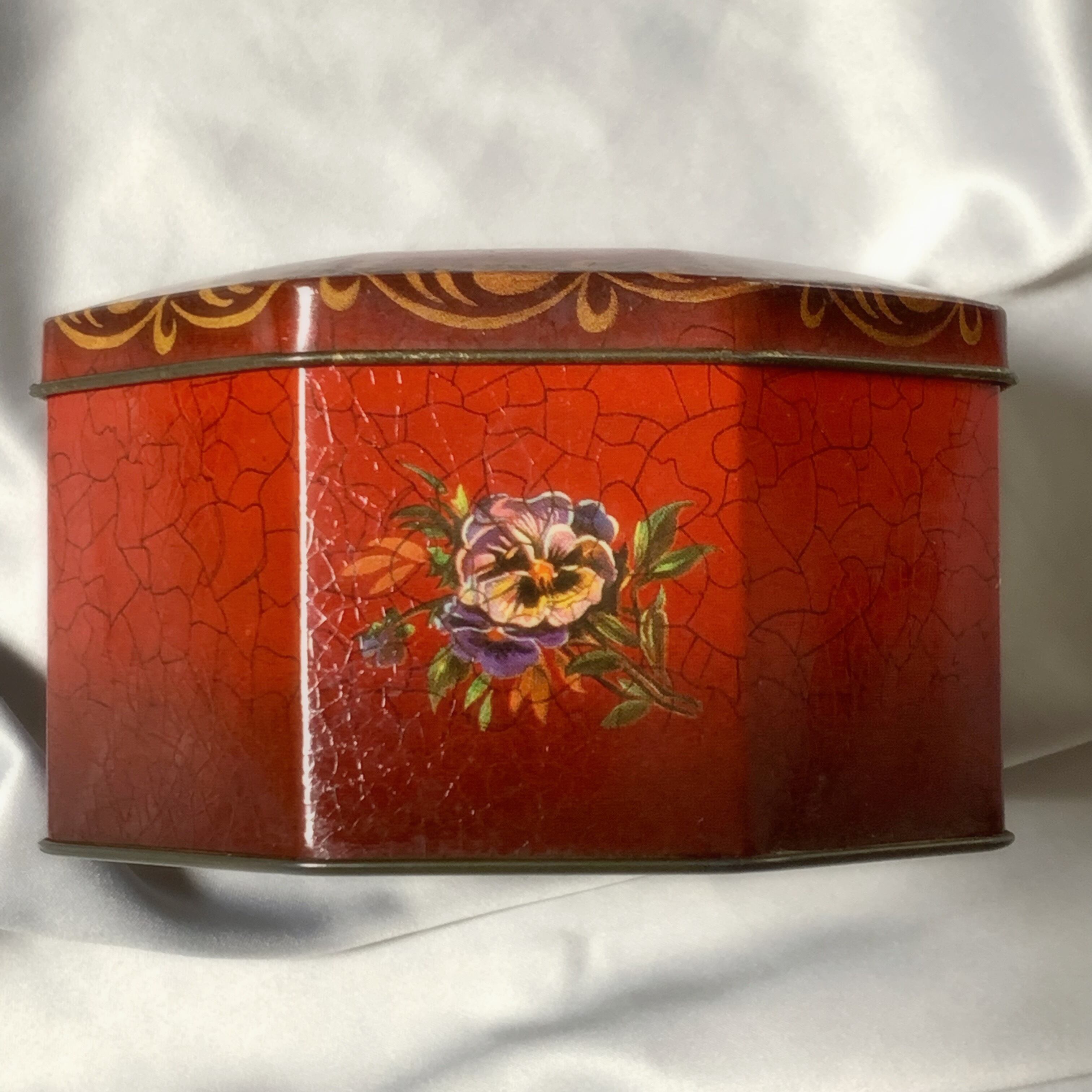 たくさんの花々が描かれている、ヴィンテージのティンボックス。