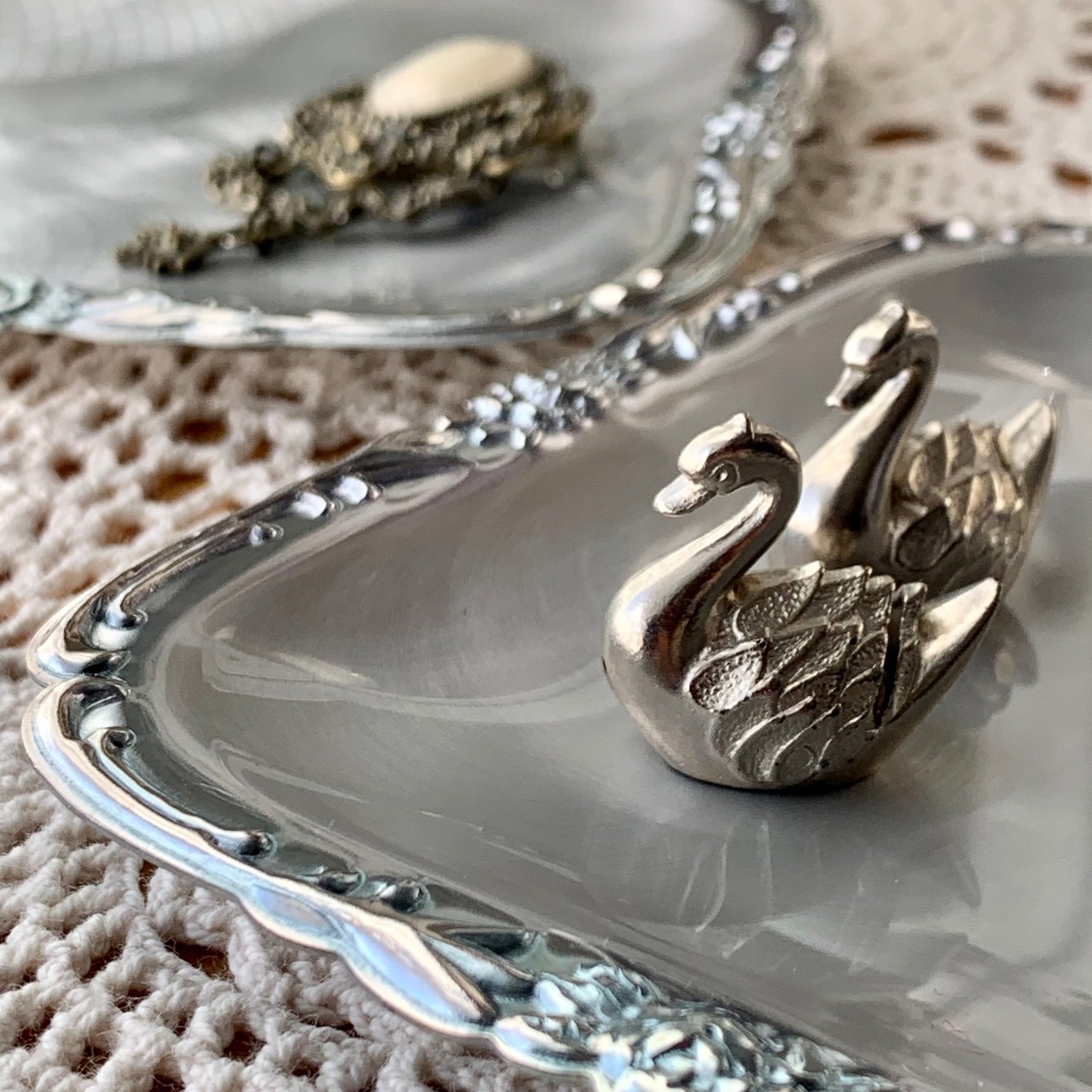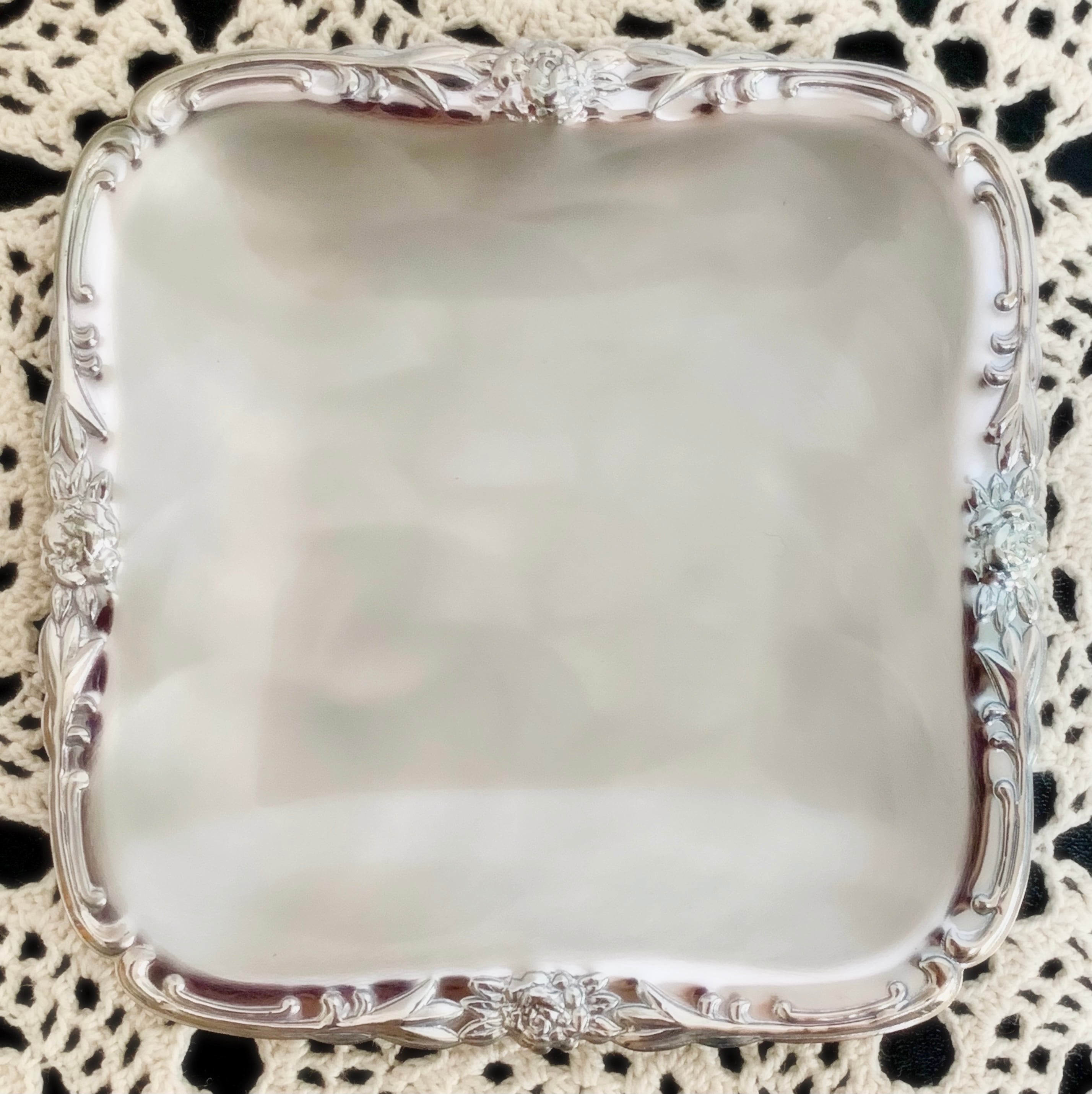 デッドストック品。シンプルながらも、花柄で縁取られた装飾が可愛らしい日本製のシルバープレートトレイです。アクセサリーや小物入れとしてもお使い頂けます。